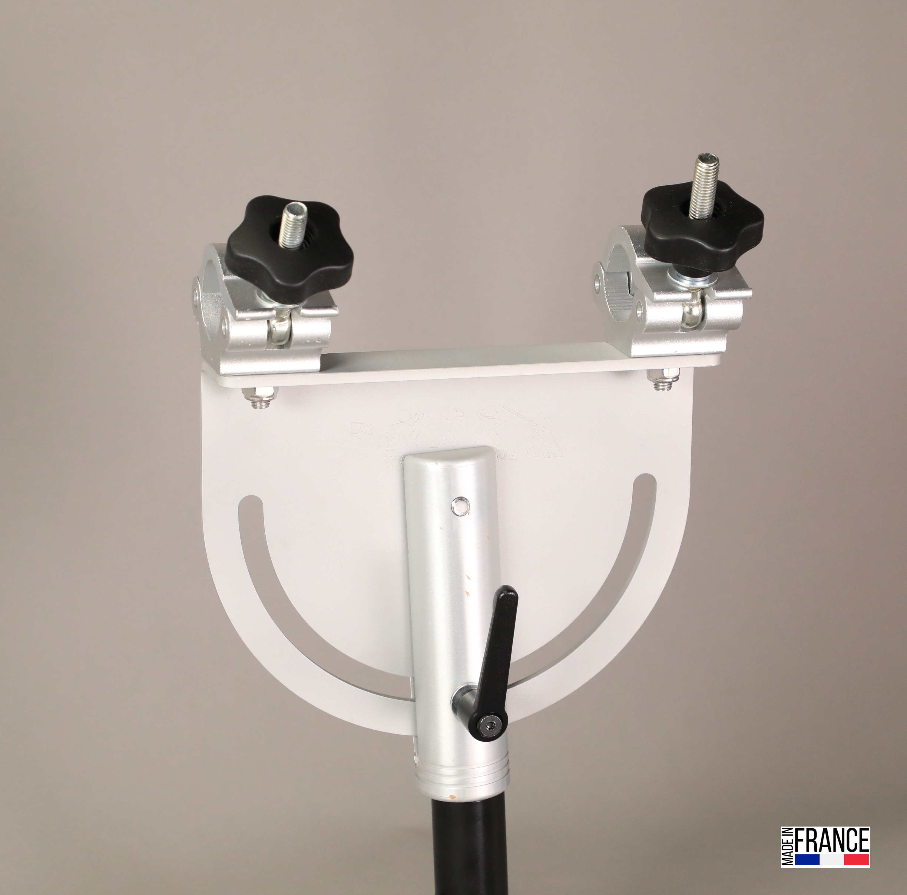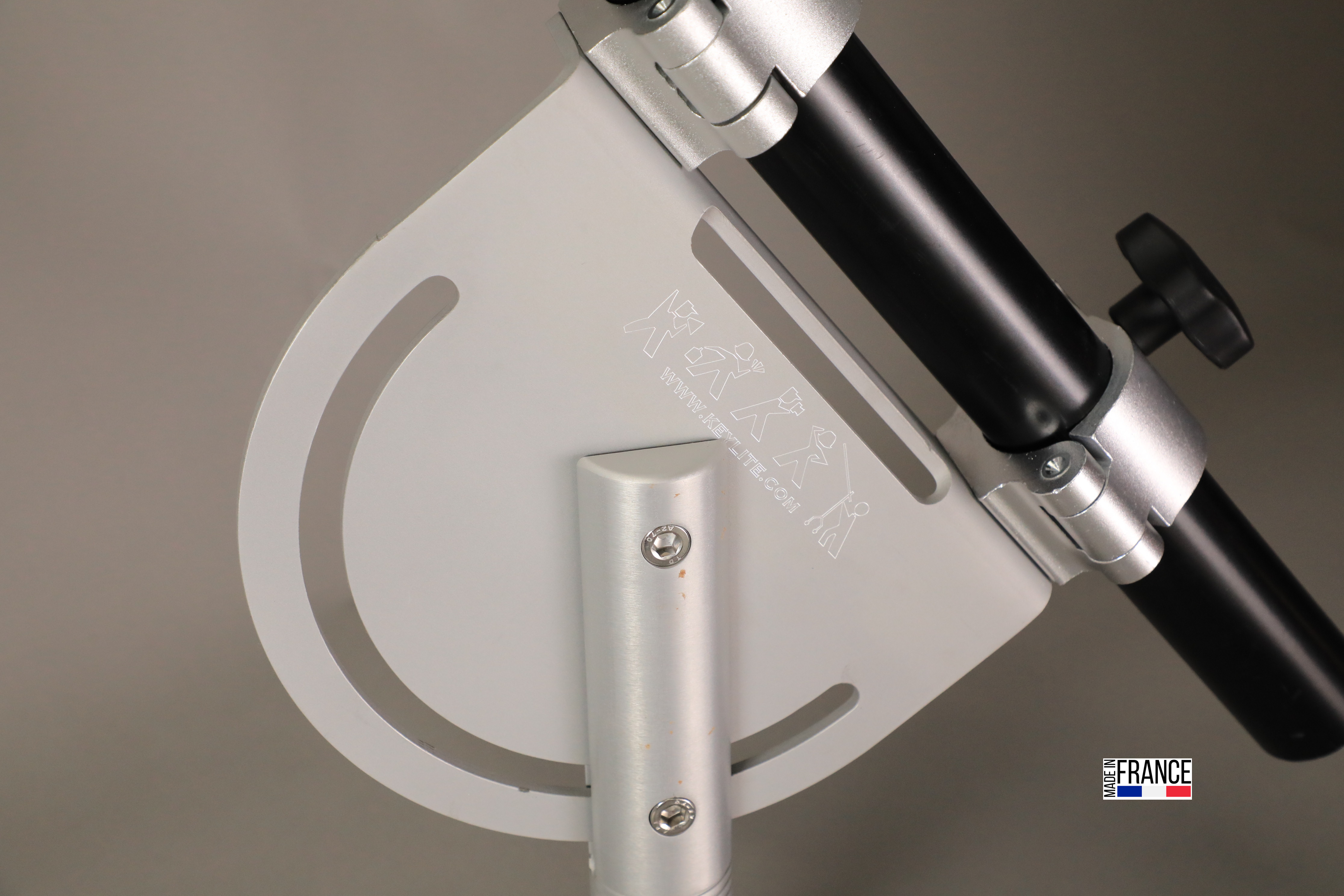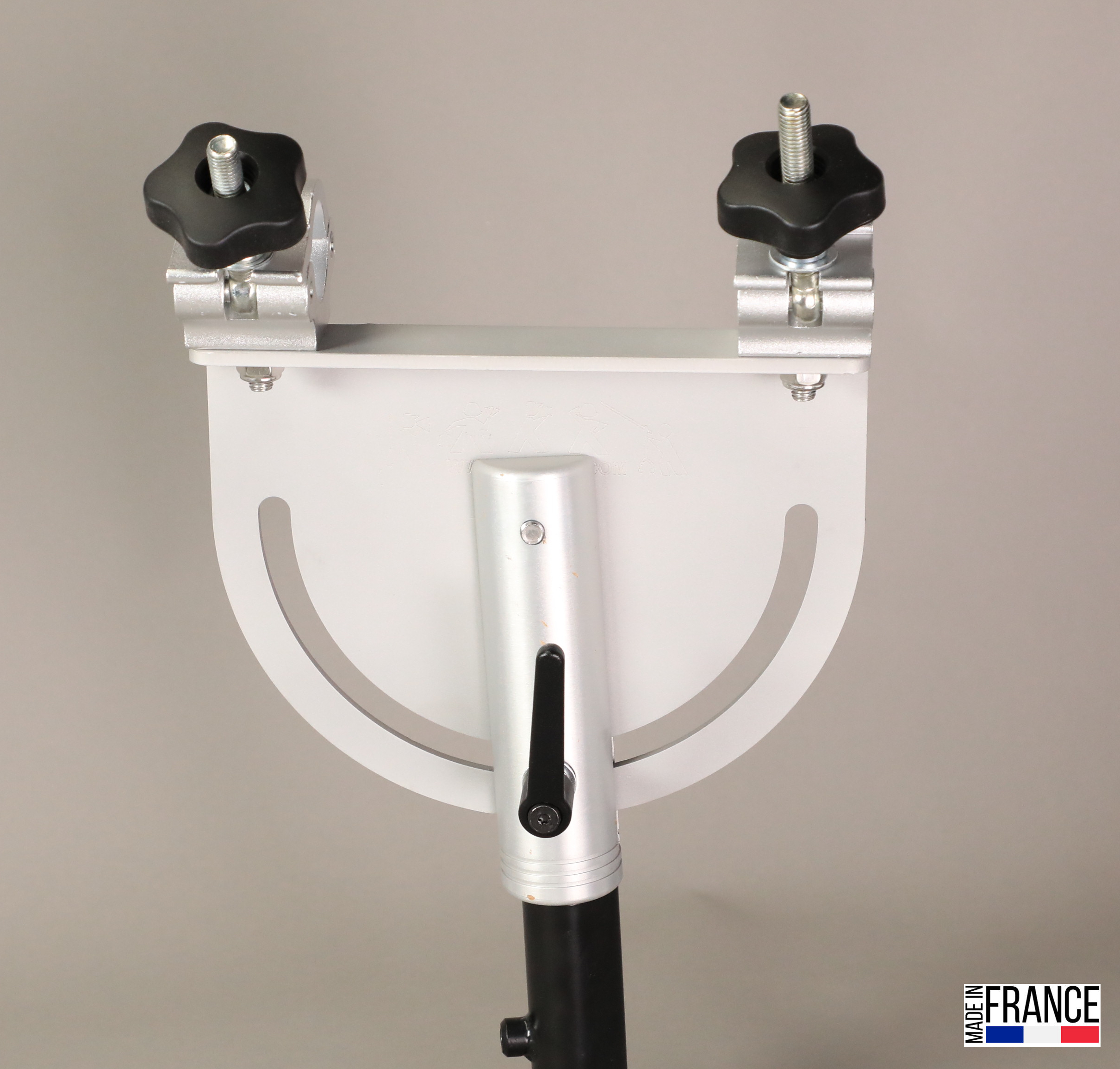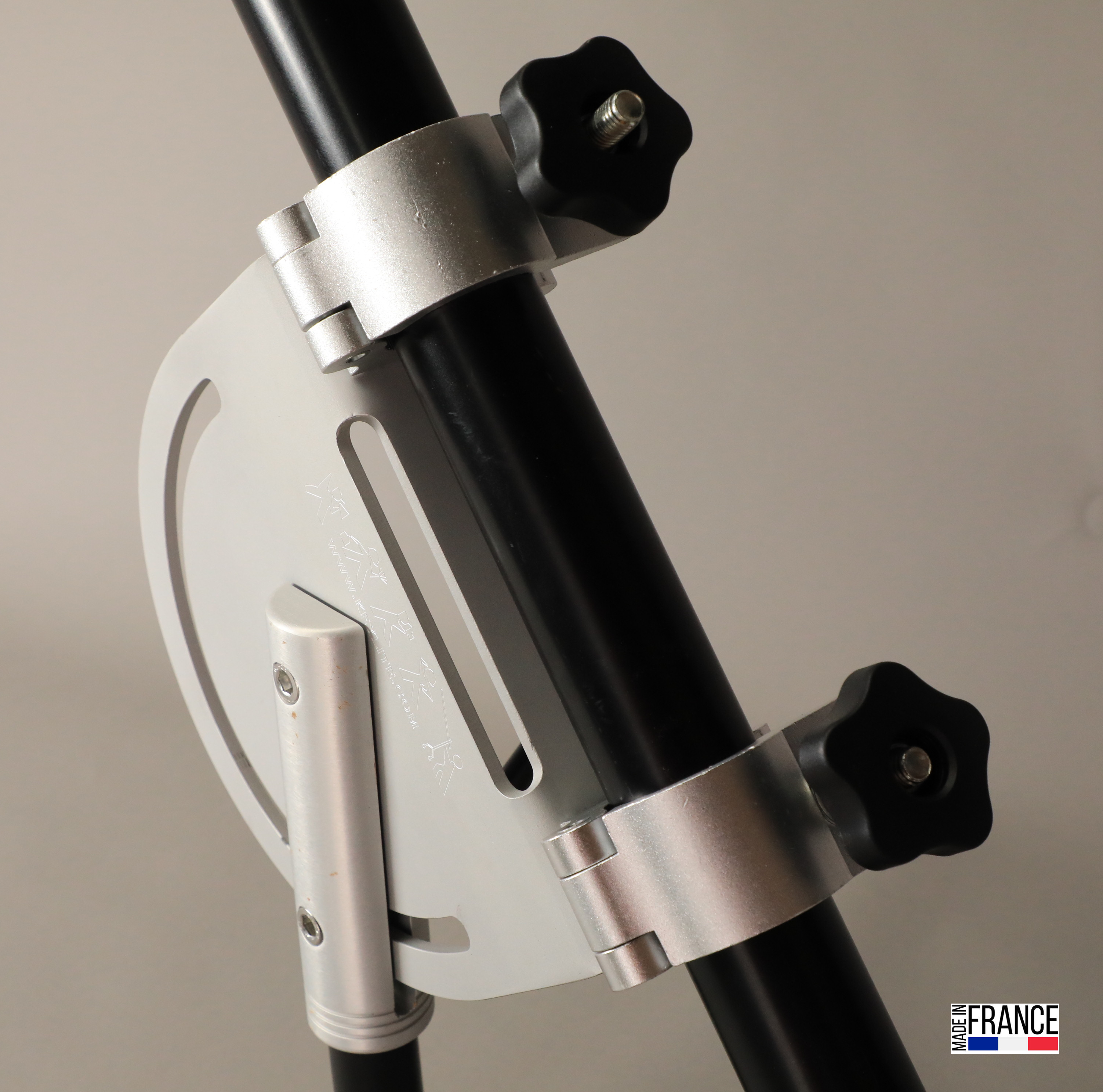 Descriptif & conseils La rotule demi lune, communement appelée sextan ou CPK sert de jonction entre des pieds cinema diametre 28mm femelle et des tubes aluminium diametre 50mm. Elle est utilisée aussi bien pour des cadres pour toile remplaçant les rotules jumbos que pour realiser des deports avec des tubes en aluminium. Lors de la realisation de deport le montage doit etre imperativement equilibré avec la quantité de leste adaptée. Realisée dans de l'aluminium de 5mm decoupé au laser ce sextan est plus resistant que certains produit sur le marché realisés en tole de 2mm d'epaisseur. l'axe est realisé par usinage dans la masse evitant l'incertitude des soudures aluminium. l'ensemble est microbillé avant de recevoir une anodisation naturelle. Le produit est livré avec 2 colliers pour recevoir du tube de 50mm muni de bouton surdimensionnés pour un serrage aisé et sans outil.